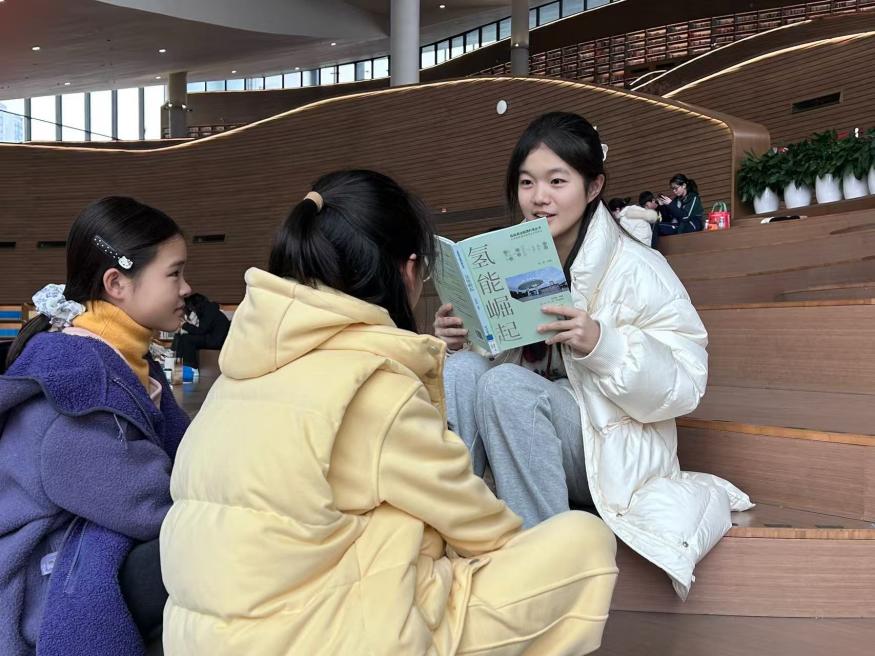活动期间,实践团成员以《氢能崛起》等专业书籍为依托,走进图书馆、社区及校园等场所,开展形式多样的宣讲与学习活动。在图书馆的阶梯阅览区,成员们围坐在一起,以 “共读 + 分享” 的形式,向身边的青少年讲解氢能的发展历程、应用场景及未来前景,用生动案例拆解专业知识,让青少年直观感受绿色能源的魅力;在社区与校园宣讲中,成员们借助平板电脑展示风电、氢能转化等可视化内容,结合图文资料与互动问答,向不同年龄段的听众普及 “双碳” 目标下的能源转型知识,引导大家关注绿色能源发展。